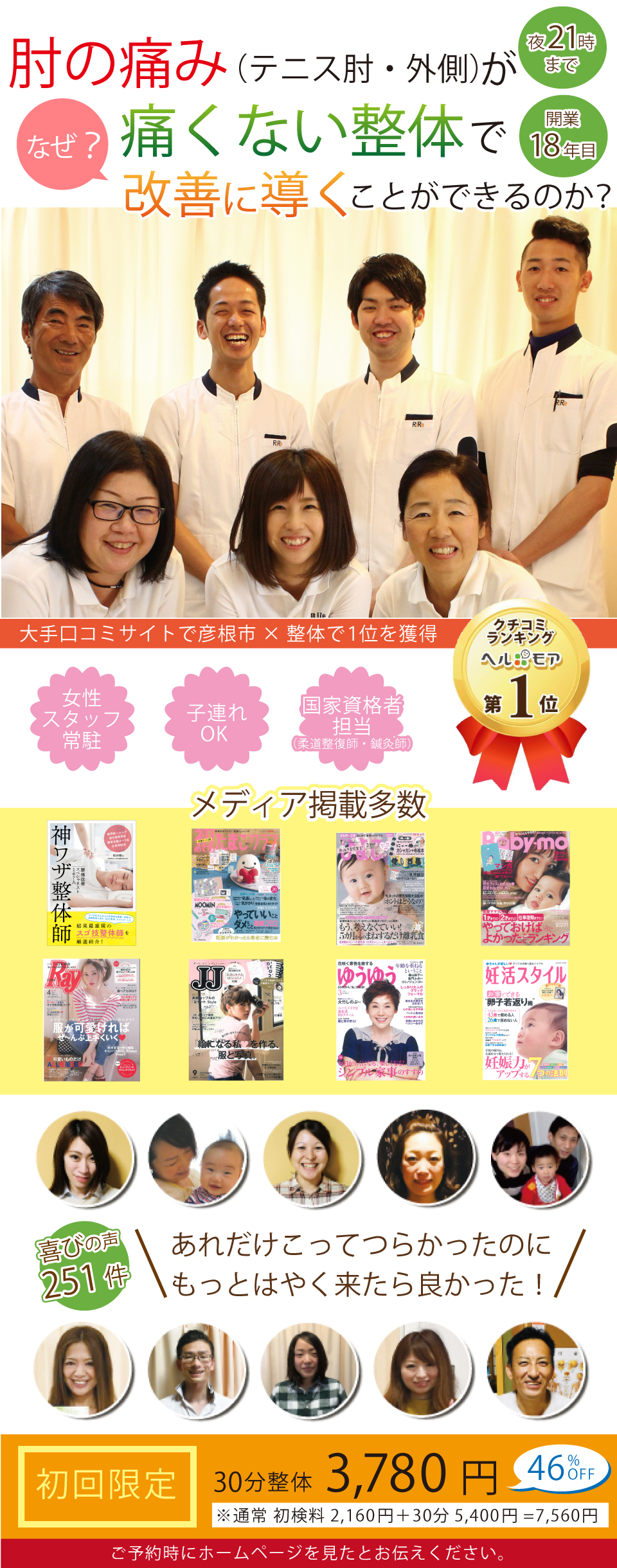 「整体は受けてみないと自分に合うかわからない・・・」という方もいらっしゃいます。そこで、「できるだけ気軽に試していただきたい!」という想いを込めて初回限定の価格3000円キャンペーンを行っております。ぜひこの機会に滋賀県彦根市の「りーる整骨院」をお試しください。