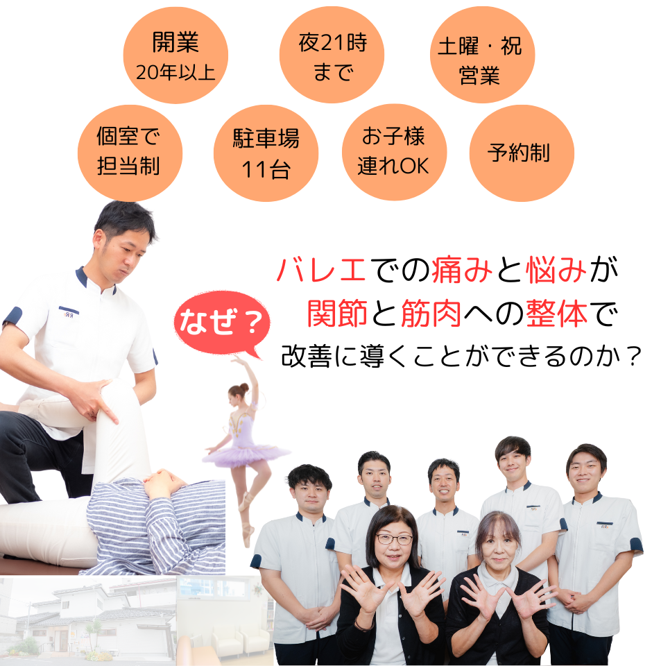 バレエの動作(ターンアウト、引き上げ、ポワントなど)は、高い柔軟性と筋力、そして全身のバランスが必要です。膝や足首の痛みの原因は、実は股関節や骨盤の使い方の癖にあることが非常に多いです。