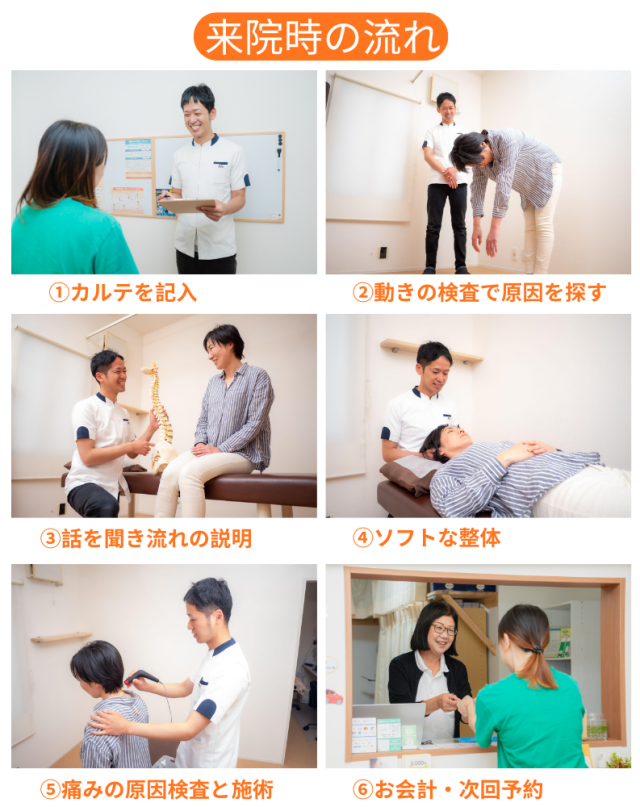 当院では、いきなり揉んで終わりではなく、しっかり悩みを聞き出し、痛みや悩みから検査をし、原因を説明する、理論的な整体で改善に導きますのでご安心ください。