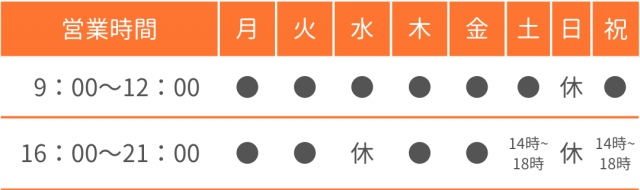 - 平日21時まで営業、土曜日・祝日も18時までやってます