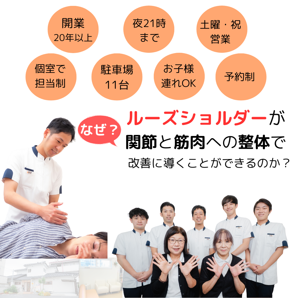 もちろん、痛みやコリを良くするだけではなく、再発を防ぐことにも自信があります。滋賀県彦根市で開院してから20年たちます。今では5人の施術者年間述べで1万人以上の方に喜んでいただくことができました。