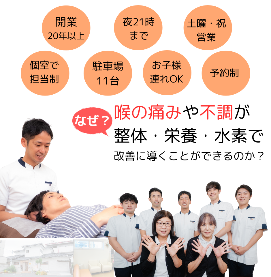「季節の変わり目に必ず喉が痛くなり、風邪をひいていましたが、整体で体の歪みを整えながら**『栄養指導』**も受けました。ビタミンや亜鉛を意識するようになってから、風邪をひきにくく、喉の調子も安定。体質が強くなったのを実感しています。(50代・女性・主婦)」