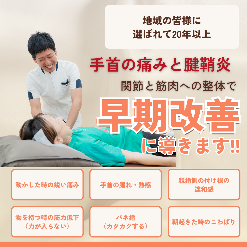 手首の痛み・しびれのある場合は、腱鞘炎の可能性が高いです。